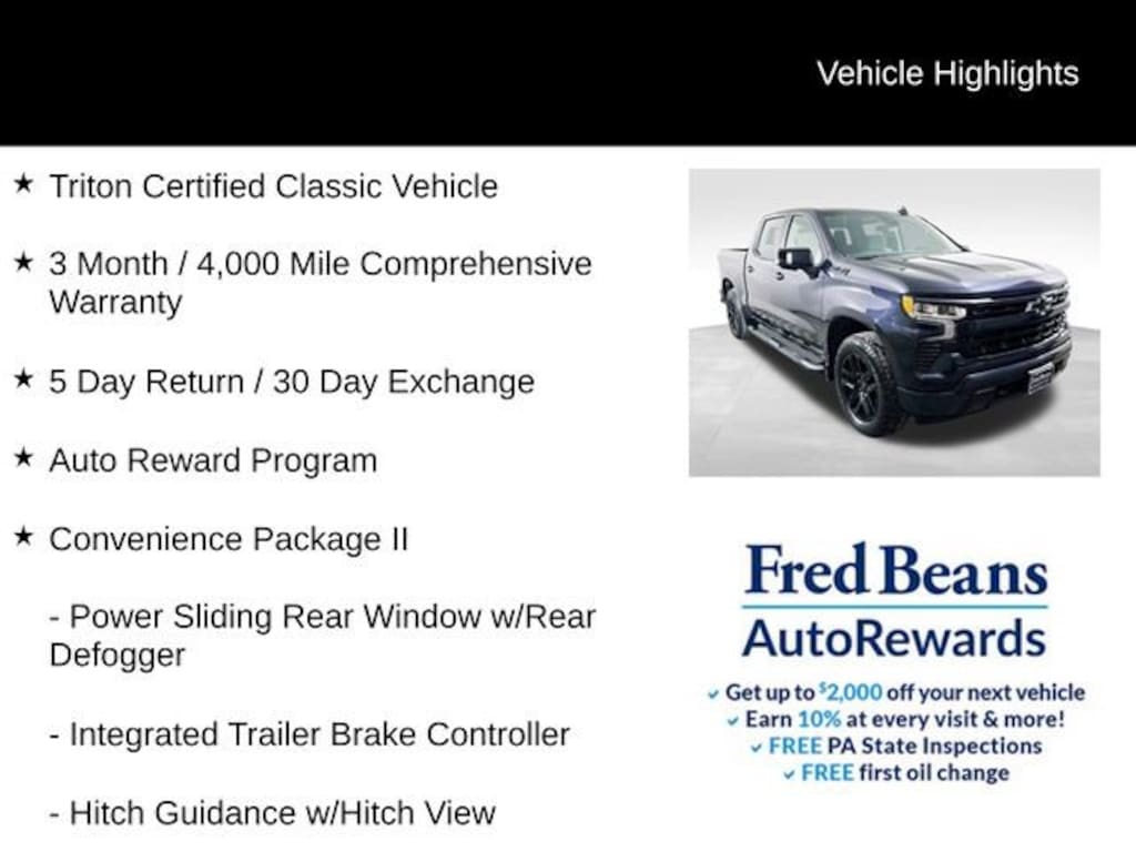 This Silverado has been meticulously inspected and certified by our expert technicians. With a comprehensive 3-month/4,000-mile warranty and a 5-day return/30-day exchange policy, you can purchase with confidence, knowing that you're getting a vehicle that has been thoroughly vetted and is ready to deliver an exceptional driving experience.